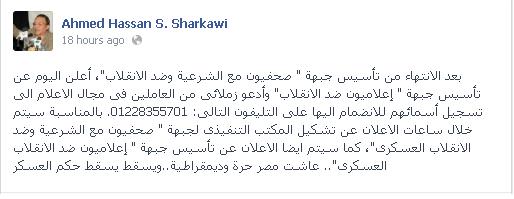 وأضاف الشرقاوى على صفحته الشخصية على موقع التواصل الاجتماعي "فيس بوك" أنه سيتم خلال ساعات الاعلان عن تشكيل المكتب التنفيذى لجبهة " صحفيون مع الشرعية وضد الانقلاب العسكرى"، كما سيتم أيضا الاعلان عن تأسيس جبهة " إعلاميون ضد الانقلاب العسكرى" .