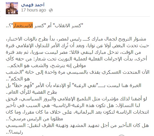 وقال فهمي في تدوينة له عبر حسابه على موقع التواصل الاجتماعي "فيسبوك" إن مشوار الترويج لجمال مبارك كرئيس لمصر، بدأ بطرح بالونات الاختبار، حيث تحدث البعض أولا عن نوايا، وبعد أن تُرِك الأمر للتداول الإعلامي فترة من الوقت، تدخل مبارك لينفي قائلا: مصر ليست سوريا، ثم بعد فترة أخرى، بدأت الإجراءات الفعلية لعملية التوريث تحت شعار: من حقه كأي مواطن إنه يترشح، والشعب هو الحكم.