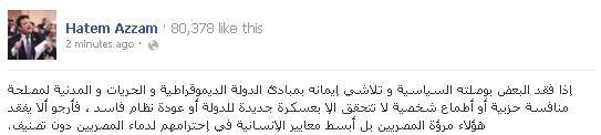 وقال حزام، عبر صفحته على الفيس بوك، "إذا فقد البعض بوصلته السياسية و تلاشي إيمانه بمبادئ الدولة الديموقراطية و الحريات و المدنية لمصلحة منافسة حزبية أو أطماع شخصية لا تتحقق الإ بعسكرة جديدة للدولة أو عودة نظام فاسد ، فأرجو ألا يفقد هؤلاء مرؤة المصريين بل أبسط معايير الإنسانية في إحترامهم لدماء المصريين دون تصنيف".
