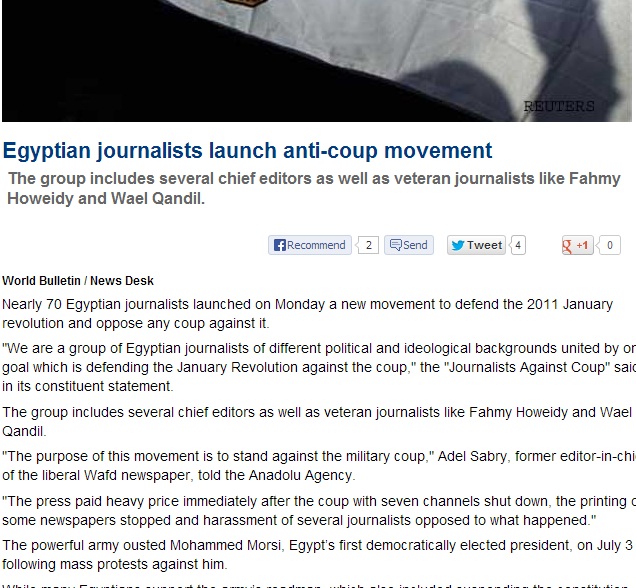 نوه موقع وورلد بوليتين التركي إلى انطلاق حركة "صحفيون ضد الانقلاب"بمشاركة 70 صحفيا مصريا، للدفاع عن ثورة يناير 2011، ومناهضة الانقلاب عليها.