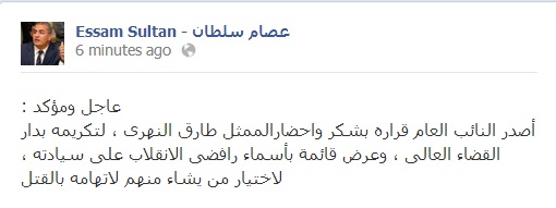 قال عصام سلطان ، نائب رئيس حزب الوسط وعضو مجلس الشعب المنحل ـ في تعليق له عبر صفحته الرسمية على موقع التواصل الاجتماعي فيس بوك "أصدر النائب العام قراره بشكر وإحضار الممثل طارق النهري، لتكريمه بدار القضاء العالى ، وعرض قائمة بأسماء رافضى الانقلاب على سيادته ، لاختيار من يشاء منهم لاتهامه بالقتل".