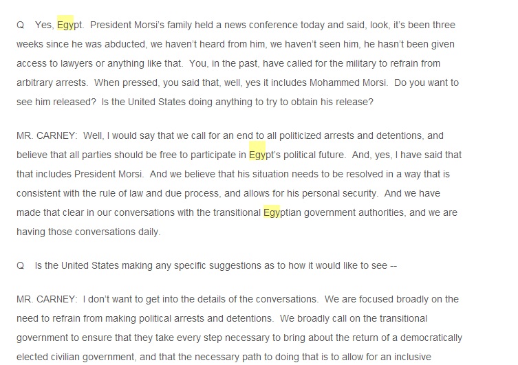 جاي كارني: حسنا، أود أن أقول أننا نطالب بإنهاء حالات الاعتقال المسيسة، ونؤمن بضرورة حرية كافة الأطراف للمشاركة في مستقبل مصر، وبالفعل لقد طالبت أن يشمل ذلك الرئيس محمد مرسي، ونعتقد أن وضعه يجب أن يتم حله بطريقة تتسق مع القانون، وتسمح بأمنه الشخصي، وقمنا بتوضيح ذلك في محادثاتنا مع الحكومة المصرية المؤقتة بشكل يومي.