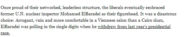 قال الكاتب الأمريكي جاكسون ديل إن اختيار الليبراليين للدكتور محمد البرادعي الذي يشغل حاليا منصب نائب الرئيس المكلف للشئون الخارجية كقائد لهم كان اختيارا كارثيا، واصفا إياه بالمتغطرس عديم الفائدة، والذي يرتاح أكثر في البقاء في صالونات فيينا بدلا من ضواحي القاهرة، مشيرا إلى أن انسحابه من انتخابات الرئاسة الماضية أعقب حصوله على نسبة هزيلة في استطلاعات انتخابات الرئاسة الماضية.