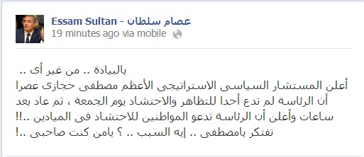 وقال سلطان ـ في تعليق له عبر حسابه على موقع التواصل الاجتماعي فيس بوك بعنوان ـ بالبيادة..من غير أي ـ "أعلن المستشار السياسي الاستراتيجى الأعظم مصطفى حجازي عصرا أن الرئاسة لم تدع أحدا للتظاهر والاحتشاد يوم الجمعة ، ثم عاد بعد ساعات وأعلن أن الرئاسة تدعو المواطنين للاحتشاد فى الميادين ..!! تفتكر يامصطفى .. إيه السبب .. ؟ يامن كنت صاحبى ..!.