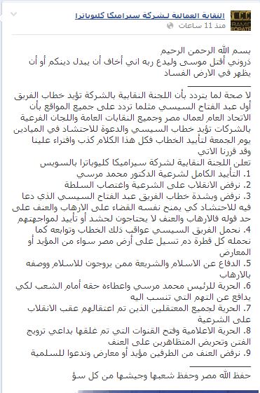 أصدرت اللجنة النقابية لشركة سيراميكا كليوباترا بالسويس بيانا نفت به ما تردد من أن اللجنة النقابية بالشركة تؤيد خطاب الفريق أول عبد الفتاح السيسي حسبما تردد على جميع المواقع بأن الاتحاد العام لعمال مصر وجميع النقابات العامة واللجان الفرعية بالشركات تؤيد خطاب السيسي والدعوة للاحتشاد في الميادين يوم الجمعة لتأييد الخطاب ، وهو ما استنكرته اللجنة .