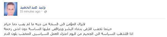 وقال عبد الحميد، عبر صفحته على الفيس بوك ، "لايزال المؤمن فى فسحة من دينه ما لم يصب دما حرام، حينما تخضب الارض بدماء البشر ويتراقص عليها الساسة دون ادنى رحمة…اذا فلتذهب السياسة الى الجحيم من اليوم اعتزل العمل السياسيى المخضب بلون الدم".