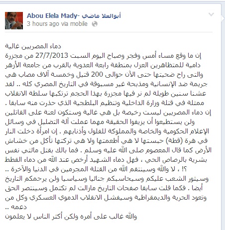 واعتبر ماضي في تدوينة على موقع "فيسبوك" اليوم السبت أن ما وقع مساء أمس الجمعة وفجر وصباح اليوم السبت من مجزرة دامية للمتظاهرين العزل بمنطقة رابعة العدوية بالقرب من جامعة اﻷزهر والتى راح ضحيتها حتى اﻵن حوالى 200 قتيل وخمسة آﻻف مصاب هي جريمة ضد اﻹنسانية ومذبحة غير مسبوقة في التاريخ المصري كله