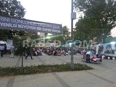 تناول مئات الأتراك طعام الإفطار، اليوم الأحد، في ساحة اعتصامهم في ميدان سراجخاني بحي الفاتح في أسطنبول للتعبير عن تضامنهم مع الشعب المصري ضد الانقلاب العسكري.