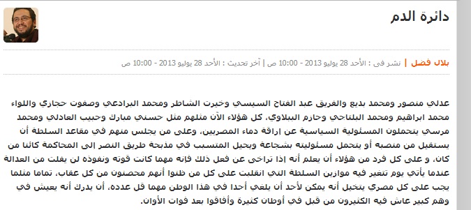 وكتب فضل في مقال بصحيفة الشروق تحت عنوان "دائرة الدم" أمس الأحد: "عدلي منصور ومحمد بديع والفريق عبد الفتاح السيسي وخيرت الشاطر ومحمد البرادعي وصفوت حجازي واللواء محمد ابراهيم ومحمد البلتاجي وحازم الببلاوي، كل هؤلاء الآن مثلهم مثل حسني مبارك وحبيب العادلي ومحمد مرسي يتحملون المسئولية السياسية عن إراقة دماء المصريين، وعلى من يجلس منهم في مقاعد السلطة أن يستقيل من منصبه أو يتحمل مسئوليته بشجاعة ويحيل المتسبب في مذبحة طريق النصر إلى المحاكمة كائنا من كان".