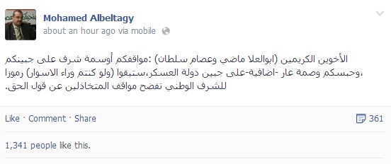 وقال البلتاجي، عبر حسابه الشخصى على "فيسبوك": " الأخوين الكريمين أبوالعلا ماضي وعصام سلطان: مواقفكم أوسمة شرف على جبينكم، وحبسكم وصمة عار إضافية على جبين دولة العسكر، ستبقوا ولو كنتم وراء الأسوار رموزا للشرف الوطني تفضح مواقف المتخاذلين عن قول الحق".