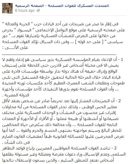 انتقد العقيد أحمد محمد على ،المتحدث العسكري، مساء أمس (الاثنين) تحريض أحد قيادات حزب " الحرية والعدالة " عبر الفيس بوك على التعرض للمنشأت العسكرية لما تقوم به" دور سياسى "، معتبره تحريض من شخص يفقد معايير الوطنية.