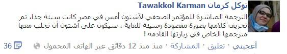 استنكرت الناشطة اليمنية توكل كرمان، الحاصلة على جائزة نوبل، اليوم الثلاثاء تحريف المترجمة لكلام كاثرين آشتون، مسئولة السياسة الخارجية في الاتحاد الأوروبي، خلال مؤتمرها أمس مع الدكتور محمد البرادعي، نائب الرئيس المعين للشئون الخارجية، مؤكدة أن الأمر كان مقصود، وقد يضطر آشتون المرة القادمة أن تأتت بمترجم خاص.