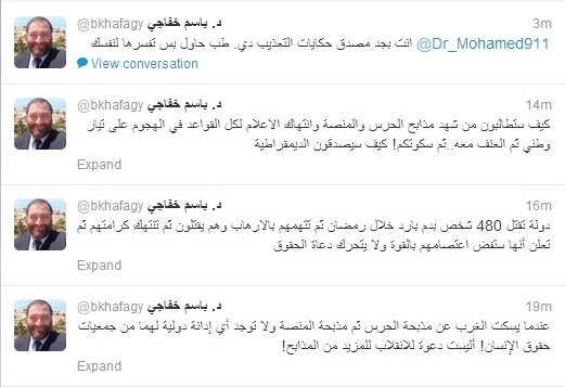 وقال خفاجي ـ في تغريدة له عبر حسابه على موقع التواصل الاجتماعي تويتر ـ "دولة تقتل 480 شخص بدم بارد خلال رمضان ثم تتهمهم بالإرهاب وهم يقتلون ثم تنتهك كرامتهم ثم تعلن أنها ستفض اعتصامهم بالقوة ولا يتحرك دعاة الحقوق".