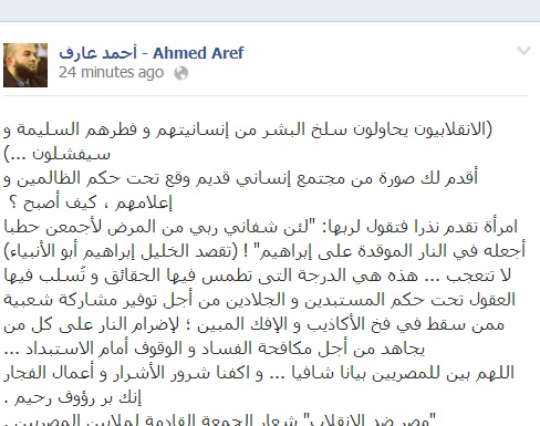 ودعا عارف قائلا: "اللهم بين للمصريين بيانا شافيا … و اكفنا شرور الأشرار و أعمال الفجار إنك بر رؤوف رحيم".