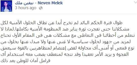 وكتبت ملاك في حسابها على موقع التواصل الاجتماعي "فيسبوك" أمس الأربعاء: "طوال فترة الحكم البائد لم نخرج أبدا عن نطاق الحلول الأمنية لكل مشكلاتنا حتى تفجرت ثورة يناير ضد المنظومة الأمنية بكاملها".