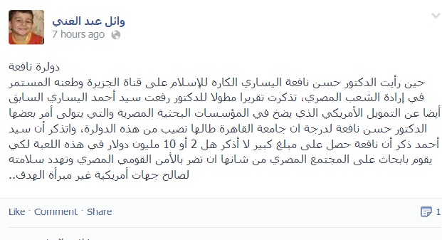 أورد الصحفي والناشط السياسي وائل عبد الغني عبر صفحته على موقع فيسبوك معلومات عن تورط الدكتور حسن نافعة في تقاضي ملايين الدولارات نظير القيام بأبحاث حول المجتمع المصري من شانها أن تضر بالأمن القومي المصري وتهدد سلامته لصالح جهات أمريكية.