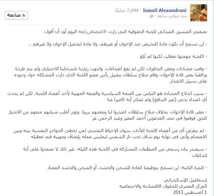 نفى إسماعيل الأسكندراني- القيادي بالمركز المصري للحقوق الاقتصادي والاجتماعي والناشط الليبرالي- طرد الوفد الحقوقي من رابعة وأن ما حدث هو مشادات كلامية بين بعض المعتصمين واللجنة.