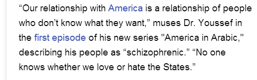 ونقلت الصحيفة عن يوسف قوله: " علاقتنا مع أمريكا هي علاقة أشخاص لا يعرفون ما يريدون، لا أحد يعرف عما إذا كنا نحب أم نكره أمريكا".