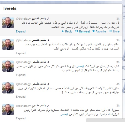 وكتب خفاجي في تغريدة أخرى: "قل أنت من مصر.. تعجب لرد الفعل. أولا نظرة أسى ثم كلمة غضب على انقلاب ثم دعاء. تكررت مرات ومرات خلال زياراتي خارج مصر منذ الانقلاب".