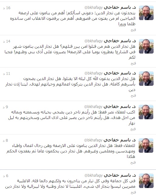 ووجه خفاجي تساؤلاته لـ"عقلاء مصر فقط" بقوله: هل رأيتم تاجر دين يضحي بحياته وبسمعته وبماله من أجل هدف؟ هل رأيتم تاجر دين يصبر على أذى الناس وسخريتهم به ليل نهار؟ هل تجار الدين ينامون على الأرصفة وهم رجال أعمال وأطباء ومهندسين ومعلمين وغيرهم؟ هل تجار دين يحكمون عاما ثم يفقدون الحكم هكذا؟