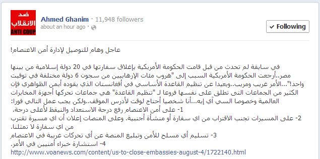 قال أحمد غانم – الناشط السياسي – إن الولايات المتحدة الأمريكية قامت بإغلاق سفارتها في 20 دولة إسلامية من بينها مصر، مضيفا أن الحكومة الأمريكية أرجعت السبب إلى "هروب مئات الإرهابيين من سجون 6 دولة مختلفة في توقيت واحد.