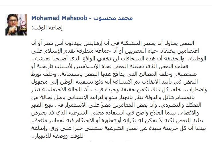 أكد الدكتور محمد محسوب، نائب رئيس حزب الوسط، أن الأزمة الحالية في مصر ليس في الإرهابيين الذين يهددون أمن الوطن، ولا المتطرفين الذين يحاولون تقديم الإسلام على الوطن، ولا المعتصمين الذين يخنقون حياة الناس، ولكن في المصالح، وحالة البغض تجاه الإسلاميين، وتورط البعض في تأييد الانقلاب.