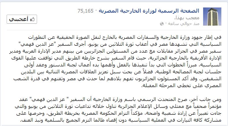 وعلى الجانب الآخر وكما قالت الصفحة الرسمية للوزارة أن المسئولون الجزائريون أكدوا تفهم بلادهم لما حدث في مصر وثقتهم في قدرة الشعب المصري على تخطي المرحلة المقبلة.