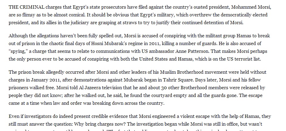 قالت صحيفة بوسطن جلوب الأمريكية إن الاتهامات التي وجهتها النيابة ضد الرئيس المصري محمد مرسي واهية للغاية لدرجة الكوميديا، وأشارت ساخرة: "مرسي أول شخص يتهم بالتخابر مع الولايات المتحدة وحماس، التي تندرج في قائمة الإرهاب الإمريكية"، في إشارة إلى عدم معقولية الاتهامات.