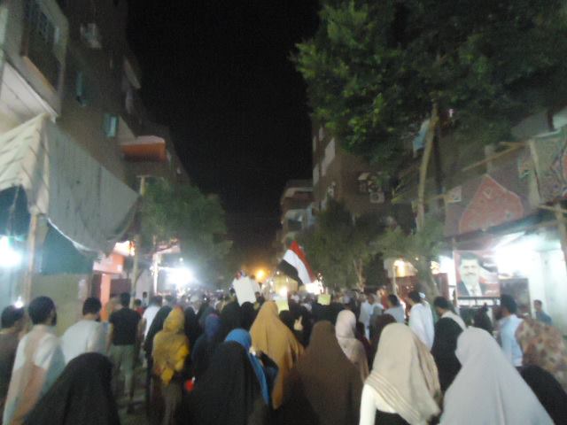 ثم انطلقت المسيرة إلى منطقة الغنايم بحري حيث يتواجد نادي حورس الرياضي التابع للقوات المسلحة للمطالبة بإسقاط السيسي وعودة الشرعية للرئيس المنتخب محمد مرسي .