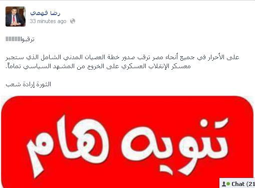 وقال فهمى فى تدوينة له على موقع فيس بوك :"على الأحرار في جميع أنحاء مصر ترقب صدور خطة العصيان المدني الشامل الذي ستجبر معسكر الإنقلاب العسكري على الخروج من المشهد السياسي تماماً ".