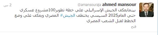 وقال أنه بينمايعكف الجيش الإسرائيلي علي خطة تطوير100مشروع عسكري حتي العام2025 السيسي يختطف الجيش المصري ويعكف علي وضع الخطط لقتل الشعب المصري.