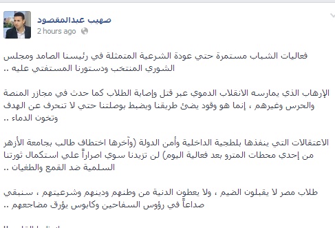 واختتم: "طلاب مصر لا يقبلون الضيم ، ولا يعطون الدنية من وطنهم ودينهم وشرعيتهم ، سنبقي صداعاً في رؤوس السفاحين وكابوس يؤرق مضاجعهم..انتظروا القادم"