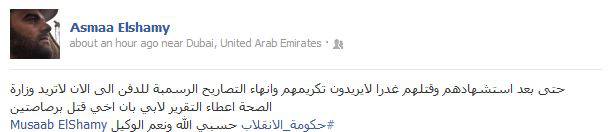 وأضافت أسماء عبر تويتر ، اليوم الخميس، عبر تويتر-"حتى بعد استشهادهم وقتلهم غدرا لايريدون تكريمهم وانهاء التصاريح الرسمبة للدفن الى الان لاتريد وزارة الصحة اعطاء التقرير لابي بان أخي قتل برصاصتين".