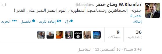 قال وضاح خنفر الصحفي الأردني من أصل فلسطيني والمدير العام لقناة الجزيرة بين عامي 2003 و2011 عبر موقع التواصل الاجتماعي "تويتر" إن: "بطولة المتظاهرين وشجاعتهم أسطورية، اليوم انتصر الصبر على القهر.