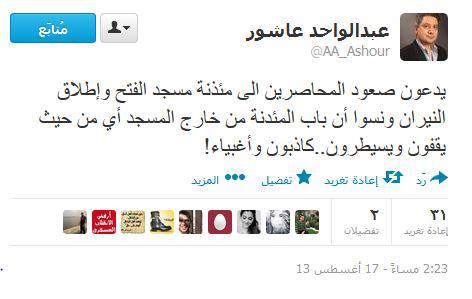 انتقد عبد الواحد عاشور -مدير تحرير وكالة أنباء الشرق الأوسط- عبر تويتر إدعاءات الانقلابيون بصعود المحاصرين إلي مئذنة مسجد الفتح لإطلاق النيران على الشرطة قائلًا "يدعون صعود المحاصرين الى مئذنة مسجد الفتح وإطلاق النيران ونسوا أن باب المئدنة من خارج المسجد أي من حيث يقفون ويسيطرون..كاذبون وأغبياء".