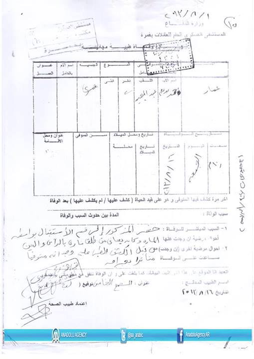 نشرت وكالة الأناضول صورة من وفاة شهادة المهندس " عمار محمد بديع " -نجل المرشد العام لجماعة- تؤكد استهدافه بقناصة في العين والرأس .