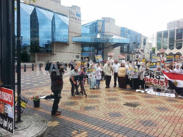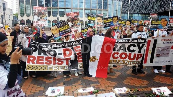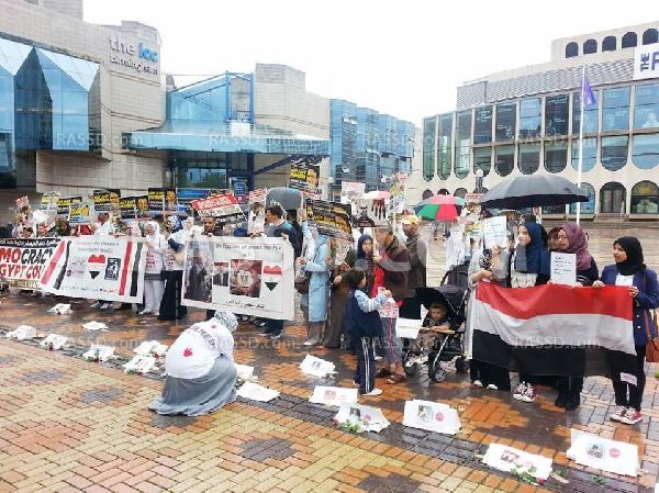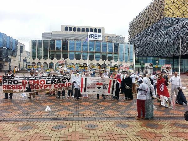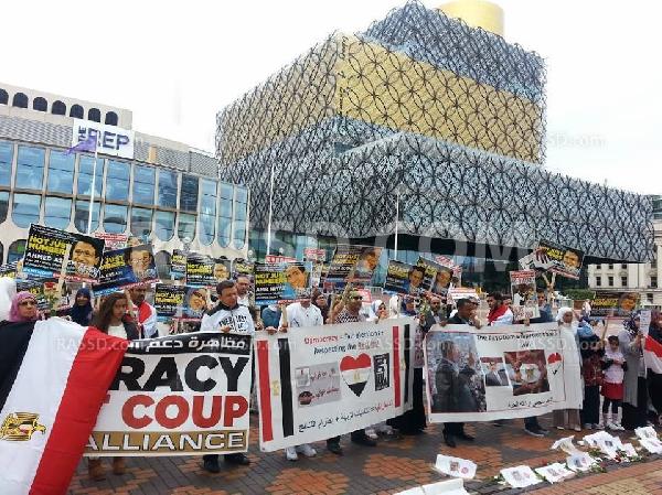 قمات الجالية المصرية اليوم بانجلترا بمقاطعة برمنجهام بعمل وقفة للتنديد بالمجازر الواقعة في مصر من قبل الانقلابيين العسكريين في حق المتظاهريين والمعتصمين السلميين الرافضين للانقلاب العسكري والمؤيدين للشرعية