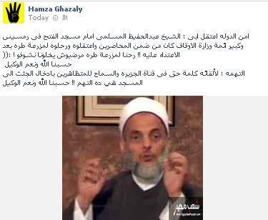 كشف حمزه الغزالي – نجل الشيخ عبد الحفيظ المسلمي الغزالي- امام مسجد الفتح على حسابه على الفيس بوك عن اعتقاله والده في أحداث رمسيس أمس.