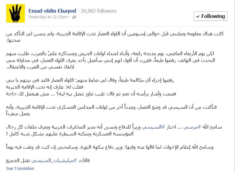 وكانت رصد قد نقلت عن الصحفي عماد السيد تدوينة له على الفيس بوك مفادها" معلومة وصلتني قبل حوالي إسبوعين أن اللواء العصار تحت الإقامة الجبرية، ولم يتسن لي التأكد من صحتها. لكن يوم الأربعاء الماضي، يوم مذبحة رابعة، وأثناء اعتداء لواءات الجيش وعساكره عليّ بالضرب، طلبت منهم التحدث في الهاتف. رفضوا طبعاً، فقررت أن أقول لهم إنني سأتصل بأحد يعرف اللواء العصار، في محاولة مني لانقاذ نفسي من الضرب والاعتقال."