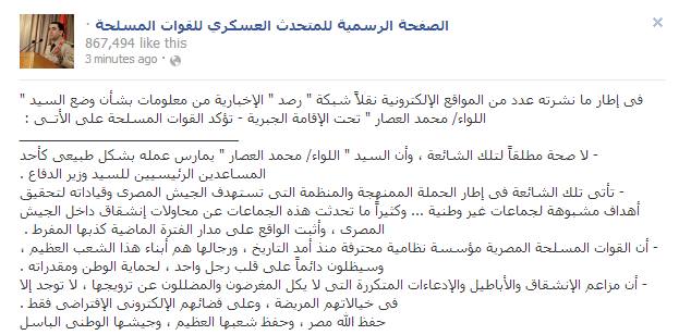وقد نشرت "رصد" الخبر مرفقا بصورة من تدوينة عماد السيد حسبما أورده على صفحته الشخصية، ورد المتحدث العسكري بالقول إنه "لا صحة مطلقًا إلى تلك الشائعة التي تناقلتها عدد من المواقع الإلكترونية عن شبكة " رصد" الإخبارية في إطار حملة ممنهجة للاستهداف بالجيش وقياداته"، على حد قوله.