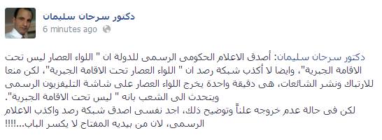 أضاف سرحان عبر حسابه الشخصى على"فيسبوك": " منعا للارتباك ونشر الشائعات، هى دقيقة واحدة يخرج اللواء العطار على شاشة التليفزيون الرسمي ويتحدث إلى الشعب بأنه " ليس تحت الاقامة الجبرية".