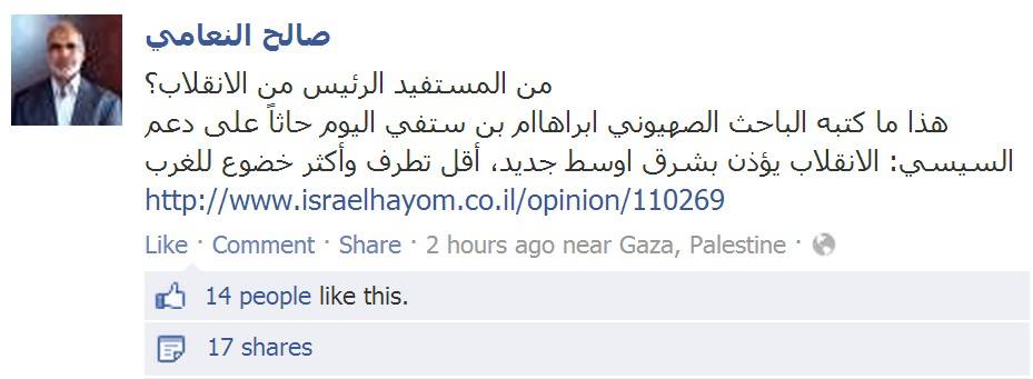 وقام النعامي بترجمة نص ما كتبه الباحث الصهيوني إبراهام بن ستفي في صحيفة "إسرائيل اليوم" حاثاً على دعم السيسي: الانقلاب يؤذن بشرق أوسط جديد، أقل تطرفًأ وأكثر خضوعًا للغرب.