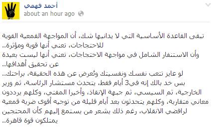 أضاف "فهمي، عبر حسابه الشخصى على "فيسبوك" اليوم الإثنين، لو عايز تتعب نفسك ونفسيتك وتُعرض عن هذه الحقيقة، براحتك، بس خد بالك إنه في3 أيام فقط، يتحدث مستشار الرئاسة، ثم وزير الخارجية، ثم السيسي، ثم جبهة الإنقاذ، وأخيرا المفتي، وكلهم يرددون معاني متقاربة، وكلهم يتحدثون بعد أيام قليلة من توجيه أقوى ضربة قمعية لرافضي الانقلاب، رغم ذلك يشعر من يستمع إليهم كأن المحتجين يمتلكون قوة قاهرة".