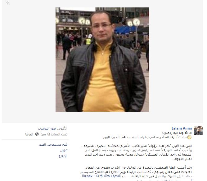 لقى منذ قليل الصحفي "تامر عبدالرؤوف" ، مدير مكتب الأهرام بمحافظة البحيرة ، مصرعه ، وأصيب "حامد البربرى" مساعد رئيس تحرير جريدة الجمهورية ، بعد إطلاق النار عليهما في أحد الكمائن العسكرية بمدخل مدينة دمنهور ، تحت زعم اختراقهما لحظر التجوال.
