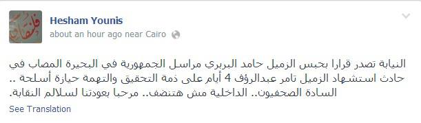 صرح الصحفي هشام يونس عضو مجلس إدارة نقابة الصحفيين بأن النيابة أصدرت قرارا بحبس الصحفي حامد البربري المصاب في حادث استشهاد الزميل تامر عبدالرؤف – والذي شهد بحقيقة ما حدث لزميله الشهيد وكشف حقيقة قتلالجيش لزميله – بالحبس 4 أيام على ذمة التحقيق بتهمة حيازة أسلحة.