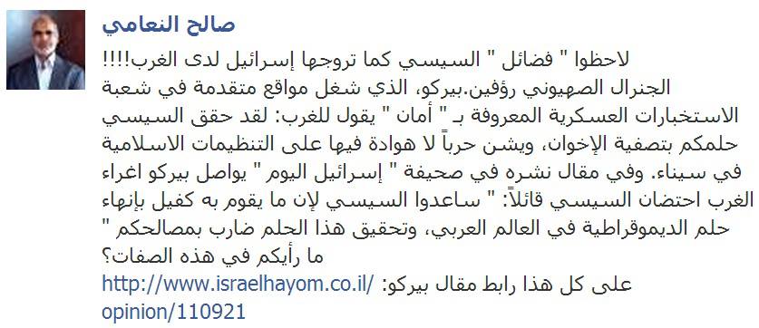 وفي مقاله المنشور في صحيفة "إسرائيل اليوم" واصل بيركو إغراء الغرب باحتضان السيسي قائلاً: " ساعدوا السيسي لأن ما يقوم به كفيل بإنهاء حلم الديموقراطية في العالم العربي، وتحقيق هذا الحلم ضارب بمصالحكم".