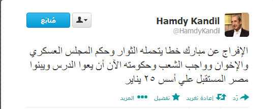 أكد الإعلامي حمدي قنديل، عبر تويتر، اليوم الجمعة أن الإفراج عن الرئيس المخلوع محمد حسني مبارك خطأ يتحمله الثوار، وحكم المجلس العسكري ،والإخوان، مشيرًا إلي أن واجب الشعب وحكومته الآن أن يعوا الدرس ويبنوا مصر علي أسس ٢٥ يناير.