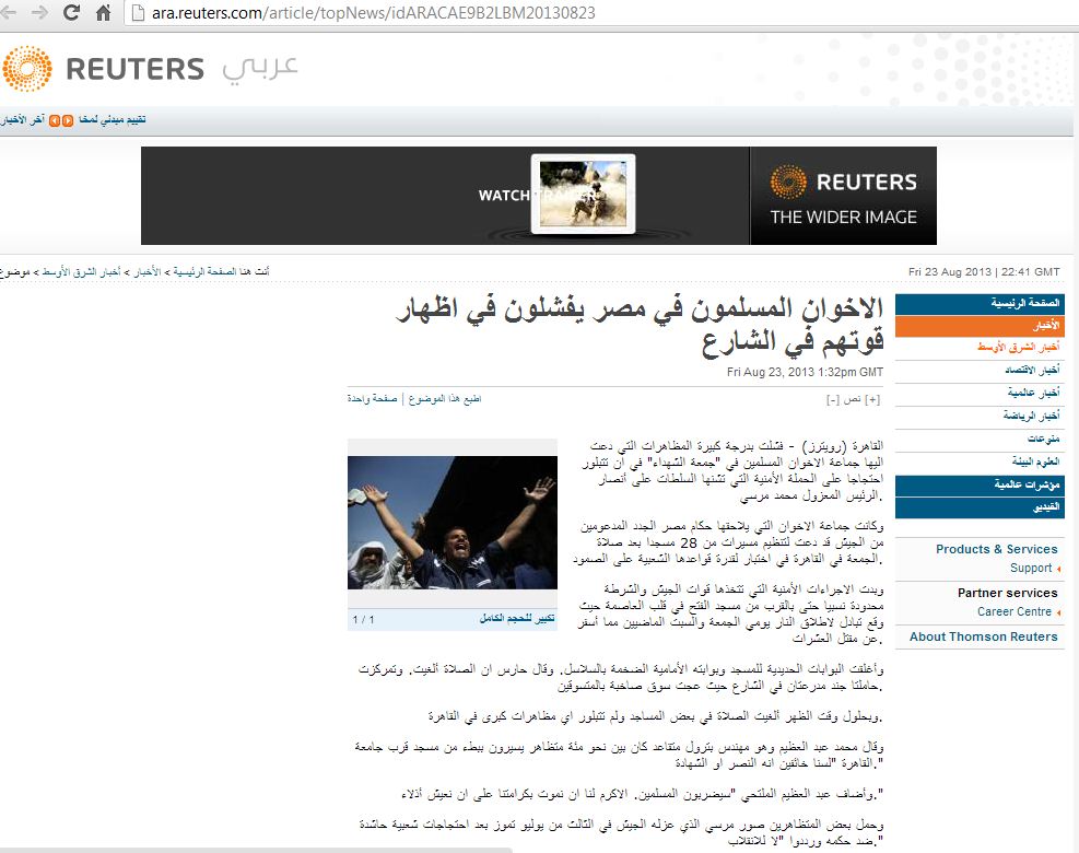 يبدو أن وكالة رويترز التي طالما اشتهرت بحيادها وموضوعيتها انضمت إلى القنوات المصرية المنحازة ، حيث ذكر التقرير الرئيسي لها اليوم بخصوص تغطية المظاهرات المعارضة للانقلاب ما يلي : " فشلت بدرجة كبيرة المظاهرات التي دعت اليها جماعة الاخوان المسلمين في جمعة الشهداء في ان تتبلور احتجاجا على الحملة الامنية التي تشنها السلطات على أنصار الرئيس المعزول محمد مرسي" .