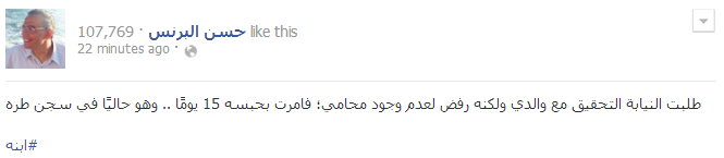 أكد نجل الدكتور حسن البرنس، نائب محافظ الأسكندرية المستقيل، عبر حساب والده على الفيس بوك، أن النيابة أمر بحبس والده 15 يوم بعدما رفض التحقيق معه في غياب محاميه، مشيرًا إلي أنه الآن في سجن طره.