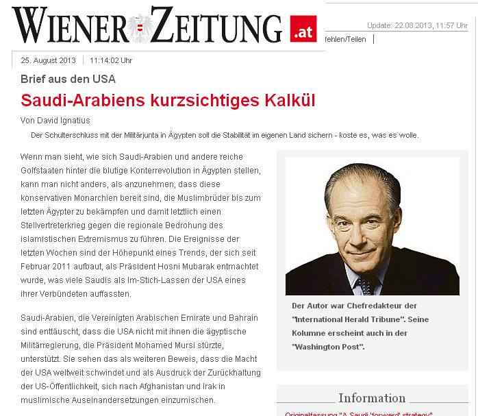 عندما نري كيف تقف السعودية وبعض الدول الخليجية الغنية وراء الثورة المضادة الدموية في مصر لا يمكن للمرء إلا أن يفترض أن تلك الأنظمة الملكية المحافظة مستعدة لأن تحارب الإخوان المسلمين حتي آخر مواطن مصري بل وأن تخوض حرباً بالوكالة ضد التهديد الإقليمي الذي يمثله التشدد الإسلامي المترتب علي ذلك كما ورد في مقال الكاتب الأمريكي ديفيد إجناتيوسDavid Ignatius. بصحفة فيينر تسايتنوج Wiener Zeitung النمساوية.